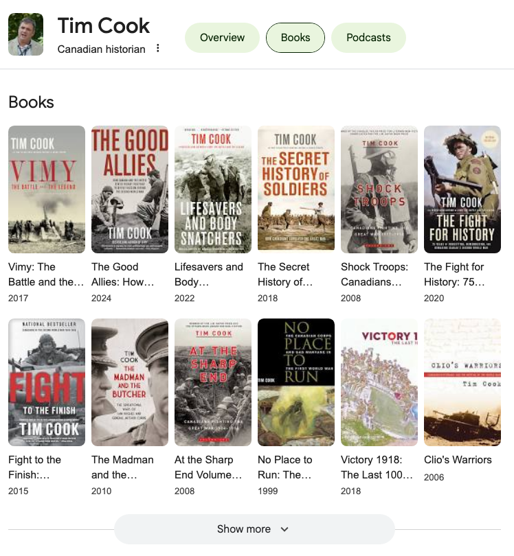 Click the link below to see a list of books authored by Canadian Military Historian, Tim Cook;